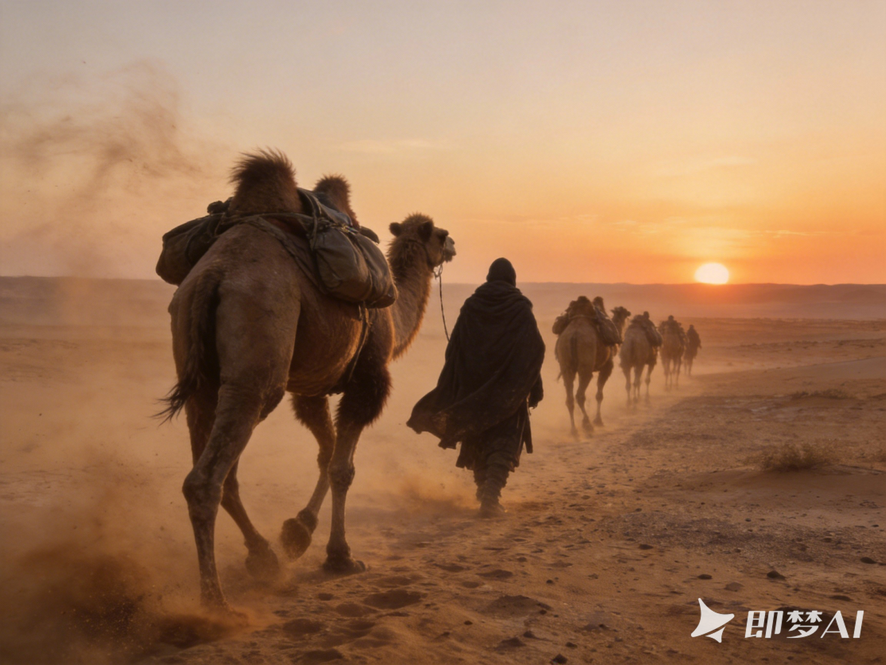 低角度跟随驼队缓慢移动,风沙流动,披风飘动,驼队脚步有节奏感,画面稳定不抖,苍凉但不压抑。