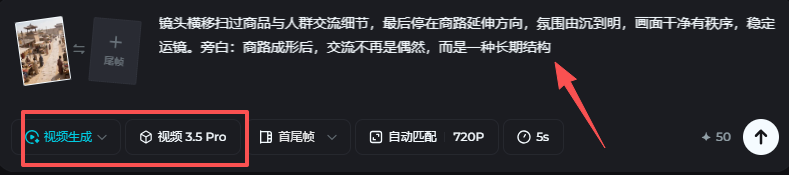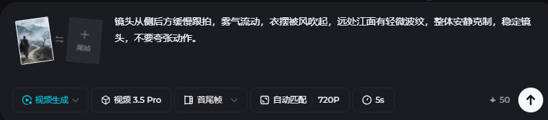 填写视频提示词(写“运镜+细微动态+氛围”,别写大剧情)