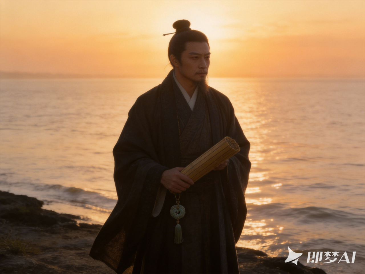 江岸黄昏逆光,江水微波与风声意象,一位士人立于岸边,手握竹简与佩玉,神情沉静决绝。写实国风,情绪肃穆克制,不血腥不猎奇,细节清晰,画面有留白。