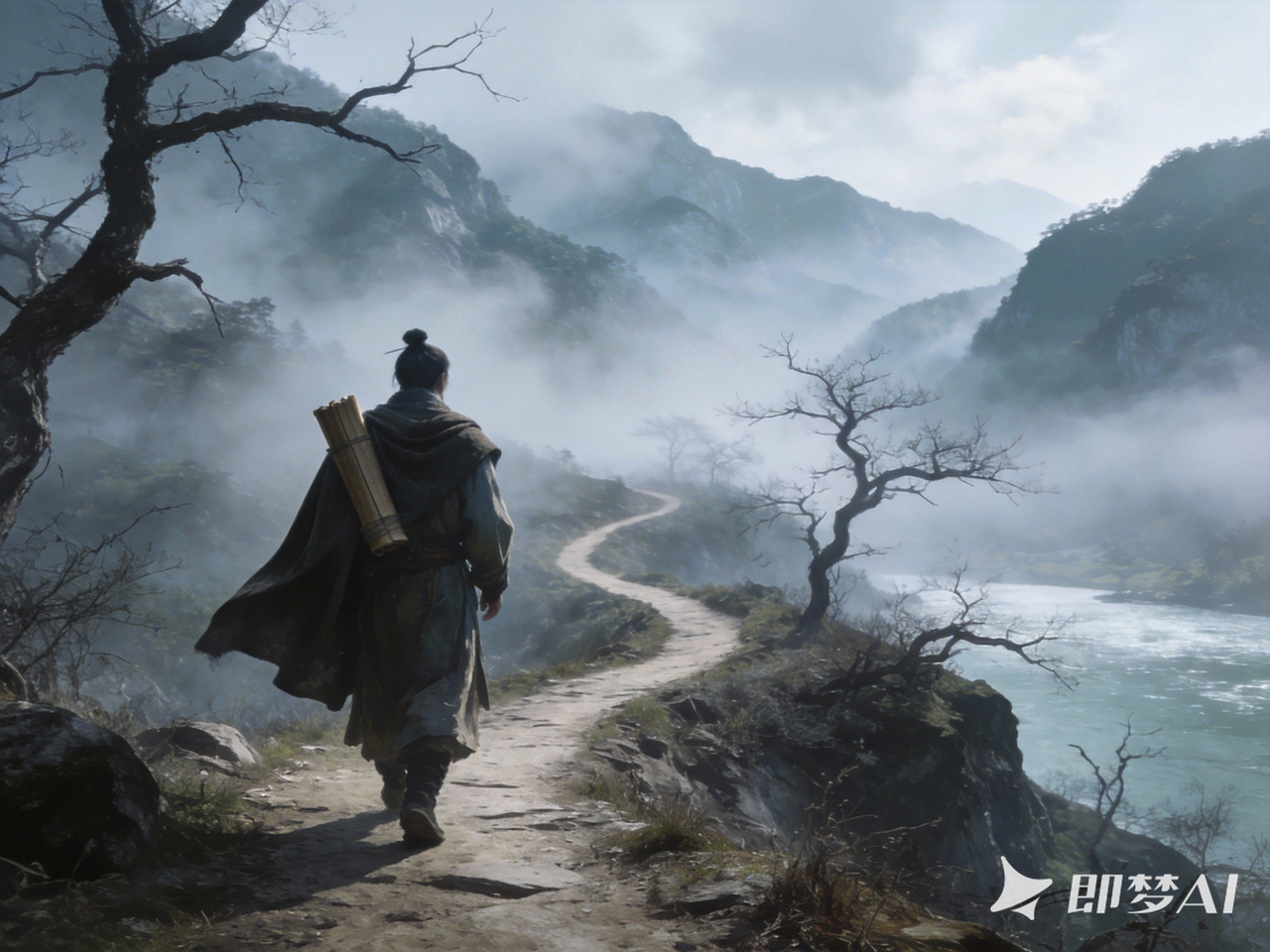 楚地山水小路,清冷薄雾,一位被放逐的士人(屈原形象)披斗篷独行,背负书卷,路旁枯树与江水远景。写实国风,冷色调,孤寂但不颓败,材质细节真实,画面干净。