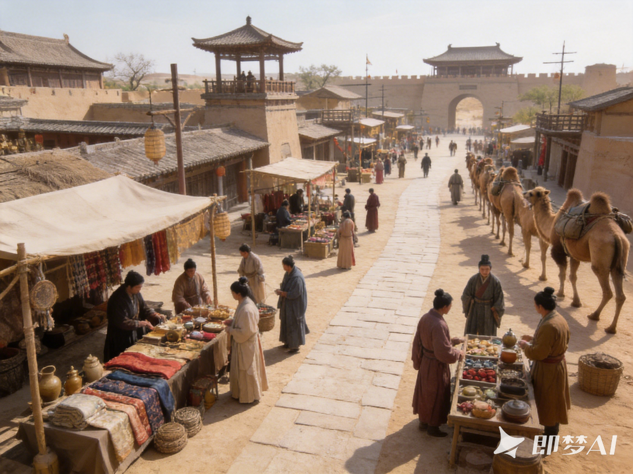 商路驿站与集市,丝绸与器物陈列,人群交流,驼队停靠,秩序清晰。