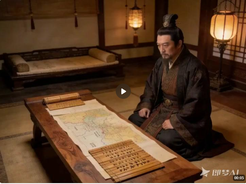 镜头从地图与简牍慢慢推到人物面部,手指轻触地图要点,烛光微动,画面稳定,纪录片风格,氛围庄重。