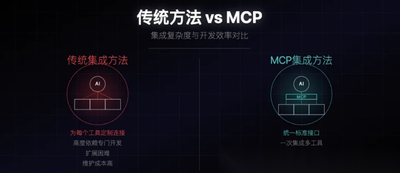 没有标准接口(MCP),每个工具都需要特殊连接方式:这会给 AI 使用工具带来巨大的挑战,增加开发和维护的复杂性。例如,每次需要使用一个新的工具,都需要重新编写代码来适配。