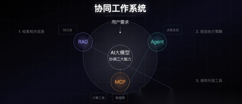 - Agent 可以通过 MCP 调用工具、获取数据,从而扩展其行动能力。
