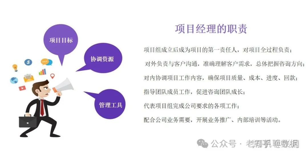 职责:负责领导和管理大数据项目。他们负责项目规划、进度控制、预算管理和团队管理等职责,以确保项目按时交付并达到预期目标。项目经理更多的偏向管理角色,对于沟通能力、统筹能力要求较高。大部分数据项目经理也是从类似于系统工程师、实施顾问一步一步晋升上来的。