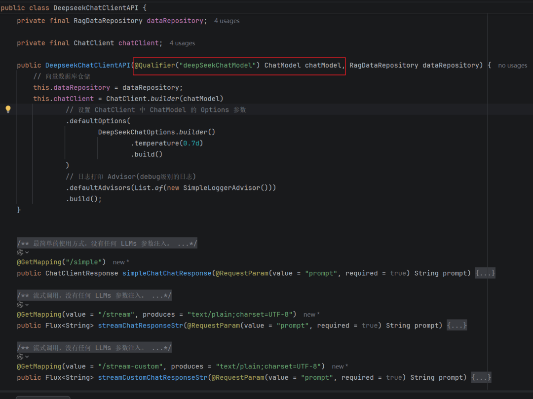 代码同前面的 OllamaChatClientAPI,唯一的区别就是注入的 ChatModel 不一样,以及相关ChatOption 不一样。