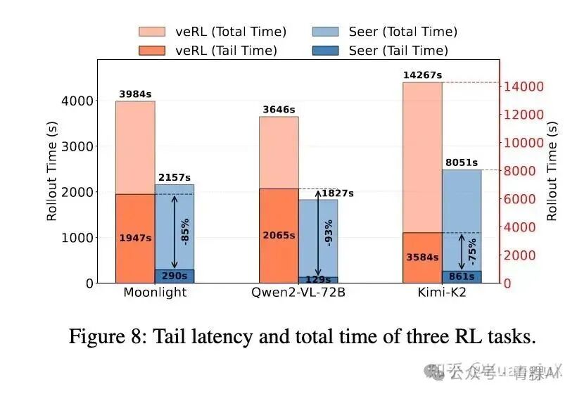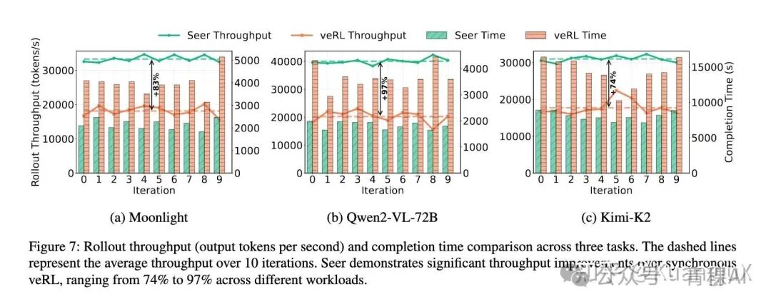 Seer 针对 Moonlight,Qwen2-VL-72B,Kimi-K2 进行了性能评估,使用 veRL 并与 Seer 共享相同的推理引擎(vLLM)以及 RL 算法(GRPO)。