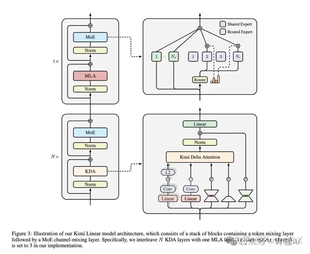 Kimi Linear 通过 3:1 的 KDA:全注意力层的机构混合,KDA 负责长序列的流式处理,控制计算内存成本;全注意力层负责全局信息的跨位置流动,避免线性注意力的信息孤岛,提升复杂推理能力。