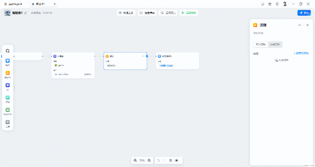 **➫调教大模型:**新建完成后,页面会有一个开始-大模型-回复的初始流程。