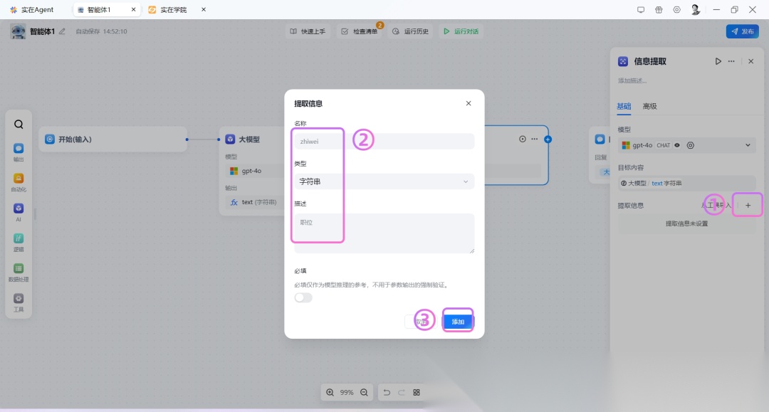 **➫插入「信息提取」节点:**这个节点的作用是让智能体自动从大模型生成的结果中,提取出岗位名称、薪资要求等参数,给到我们下一步要调用的「RPA 流程」节点。