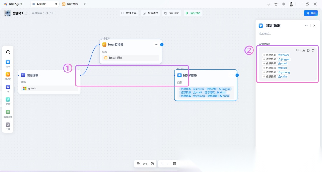 **➫结果确认:**将「信息提取」和「回复」节点相连,方便我们查看智能体筛选的岗位信息是否与自己需求相匹配。不满意就继续调提示词,直到找到完美答案!