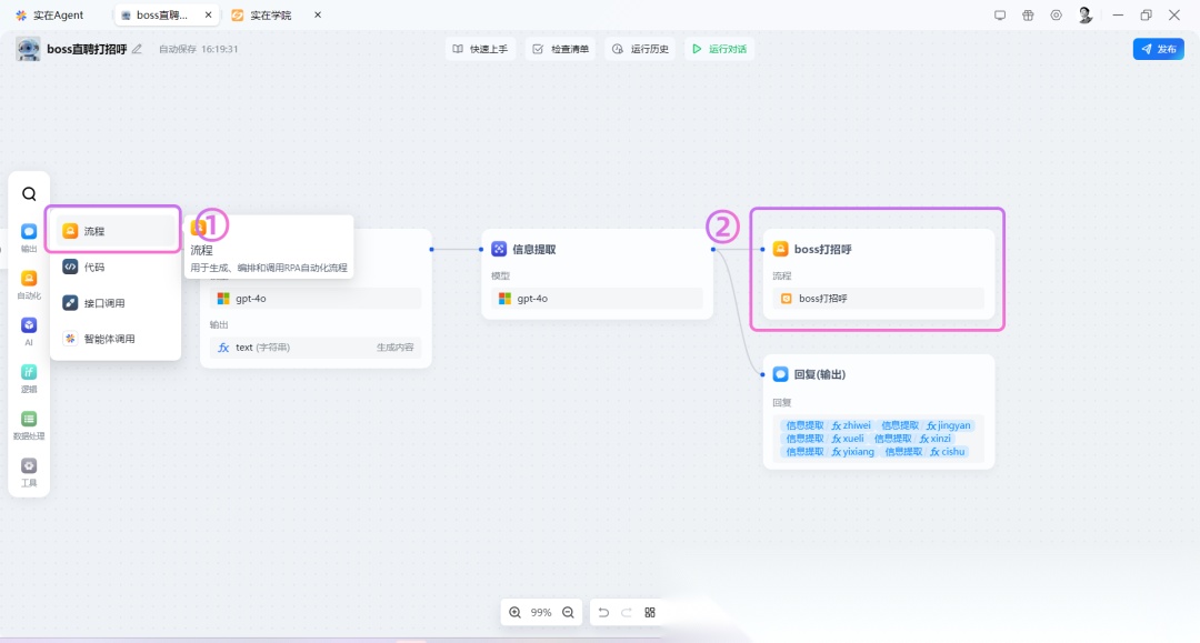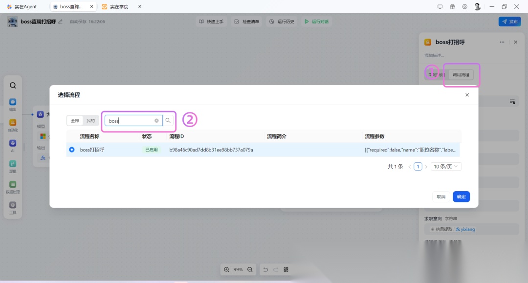**▸调用已有流程:**直接下载我们提供的【BOSS 直聘智能筛选并打招呼】流程包,然后上传到“实在-智慧中心”,最后在智能体中调用该流程,并把刚刚提取的信息填进去,这样智能体就知道该找啥样的大神啦!