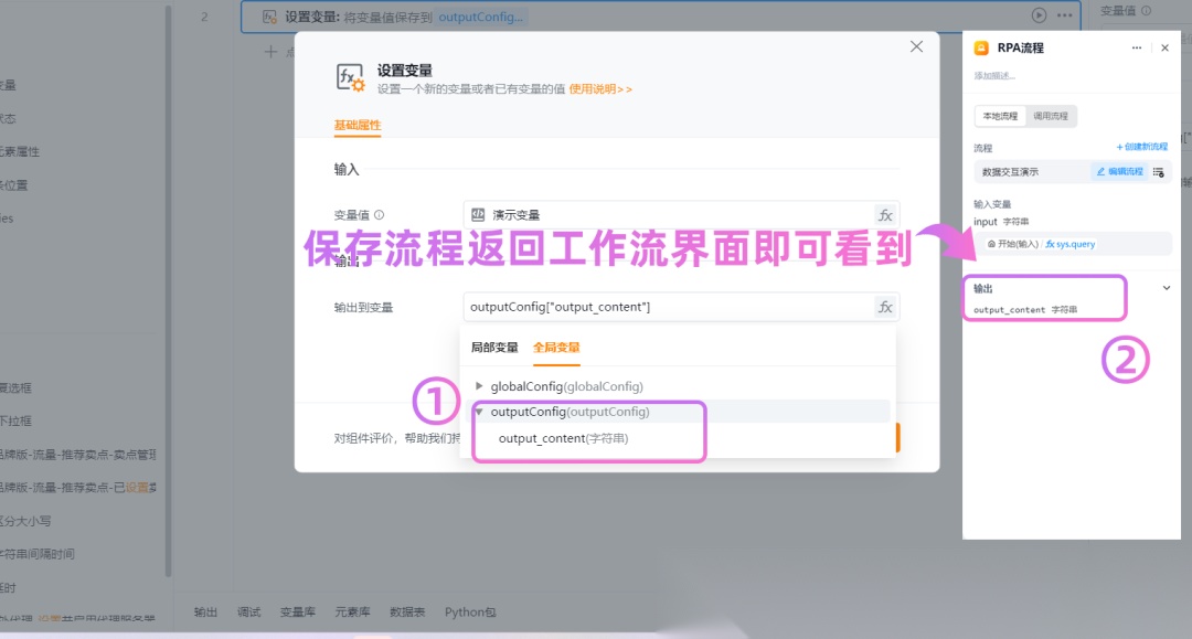 2️⃣ 把要传递的数据或变量填入这个全局变量,保存流程。返回工作流页面即可看到 RPA 流程有「输出」啦!
