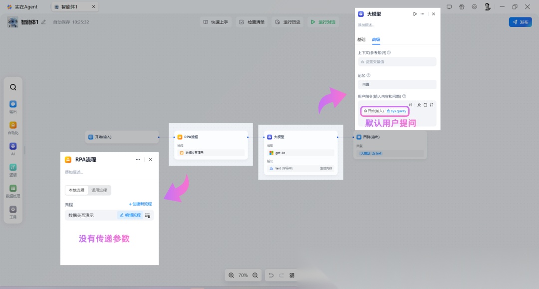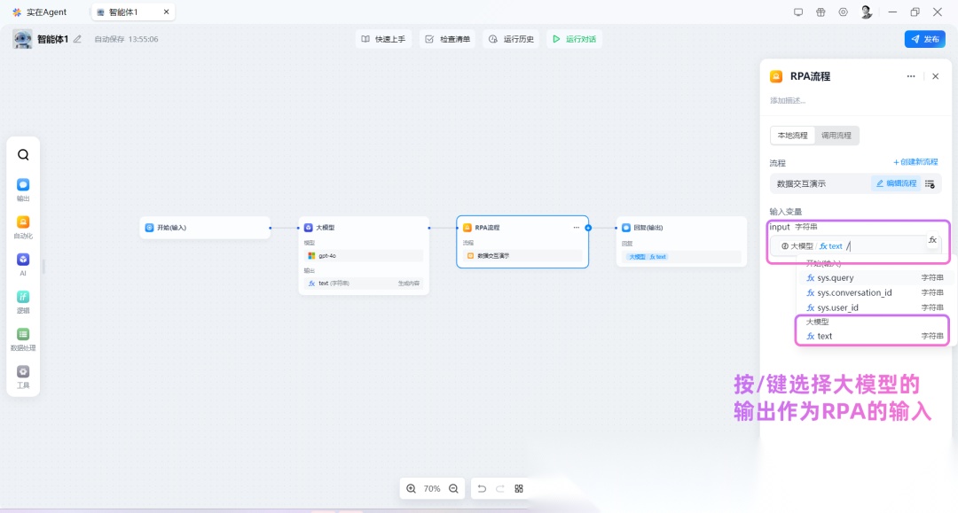 3️⃣ 切换到大模型组件,直接把 RPA 的输出拖过来当输入 —— 数据成功传递,大功告成!