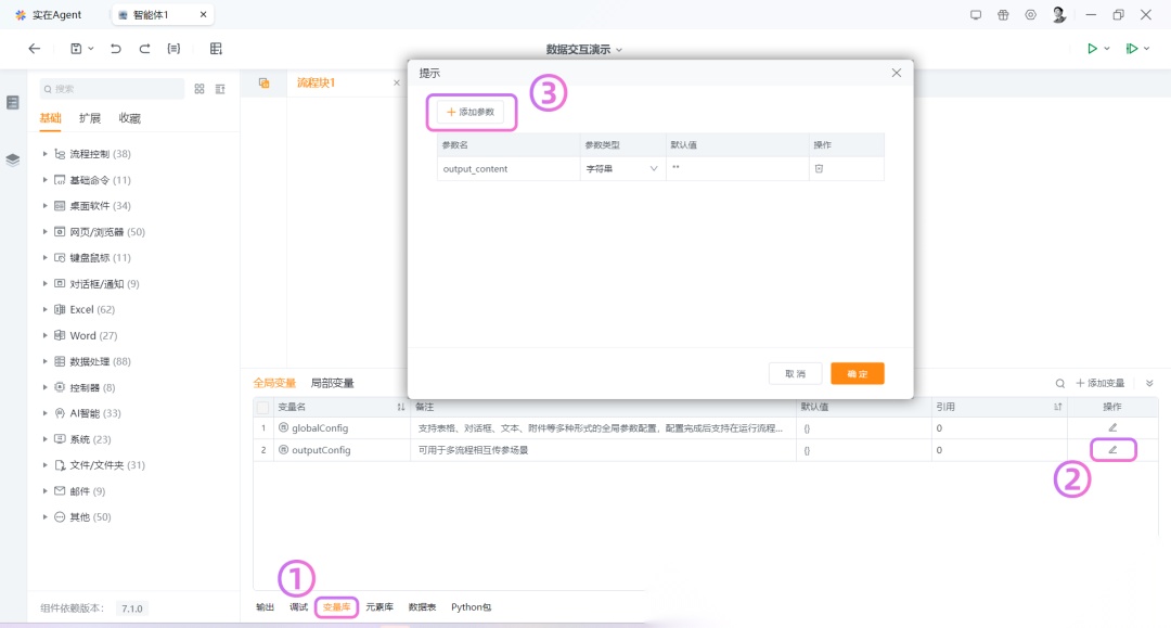 1️⃣ 打开 RPA 编辑流程 → 进入变量库 → 找到 outputConfig 输出配置,点【添加参数】,因为我们要输出的是字符串类型的文本内容,就把变量名设为 output_content!
