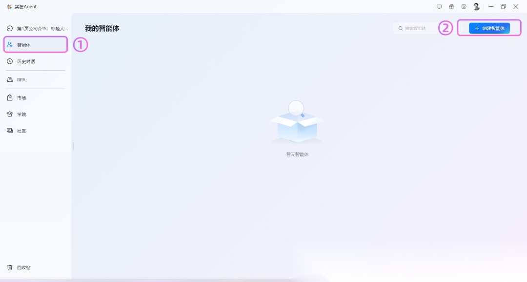 打开客户端:登录实在 Agent,点击【智能体 - 创建智能体】开启空白画布~