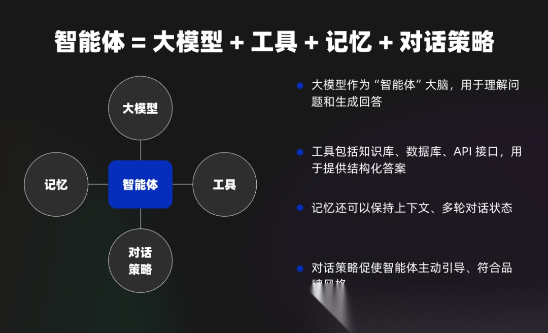 智能体 = 大模型 + 工具 + 记忆 + 对话策略。