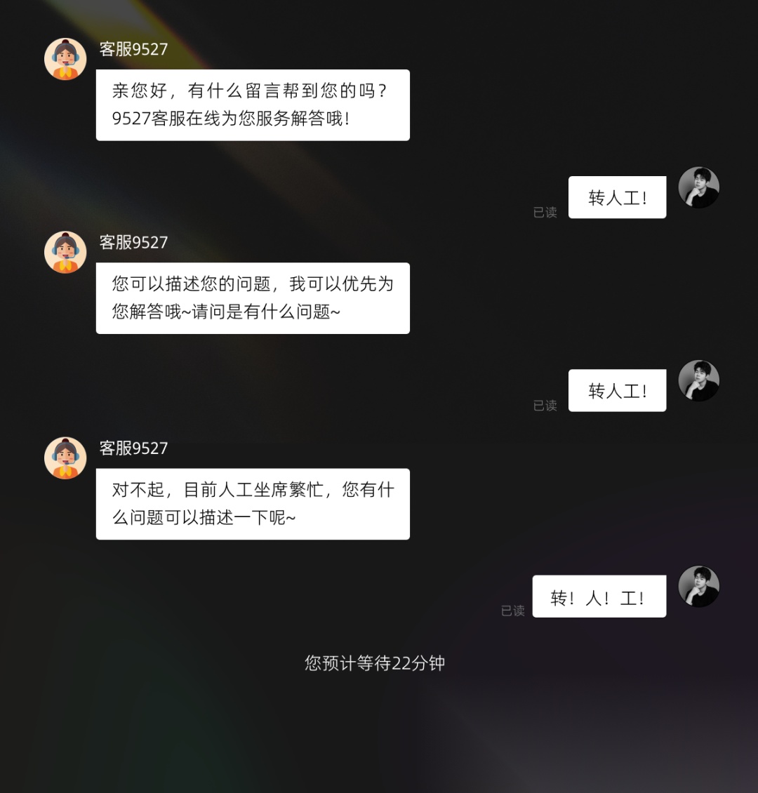 面对这种情况,我们也只得猛发转人工!转人工!转人工!