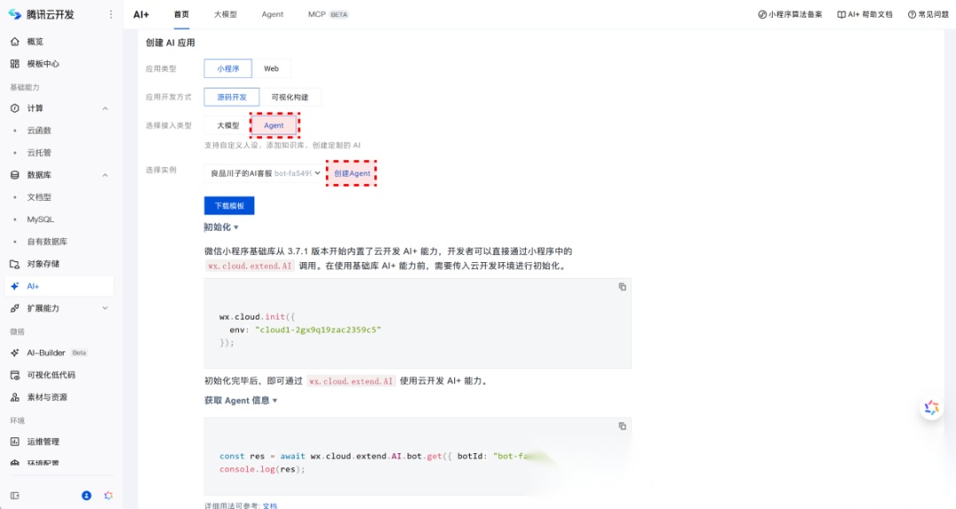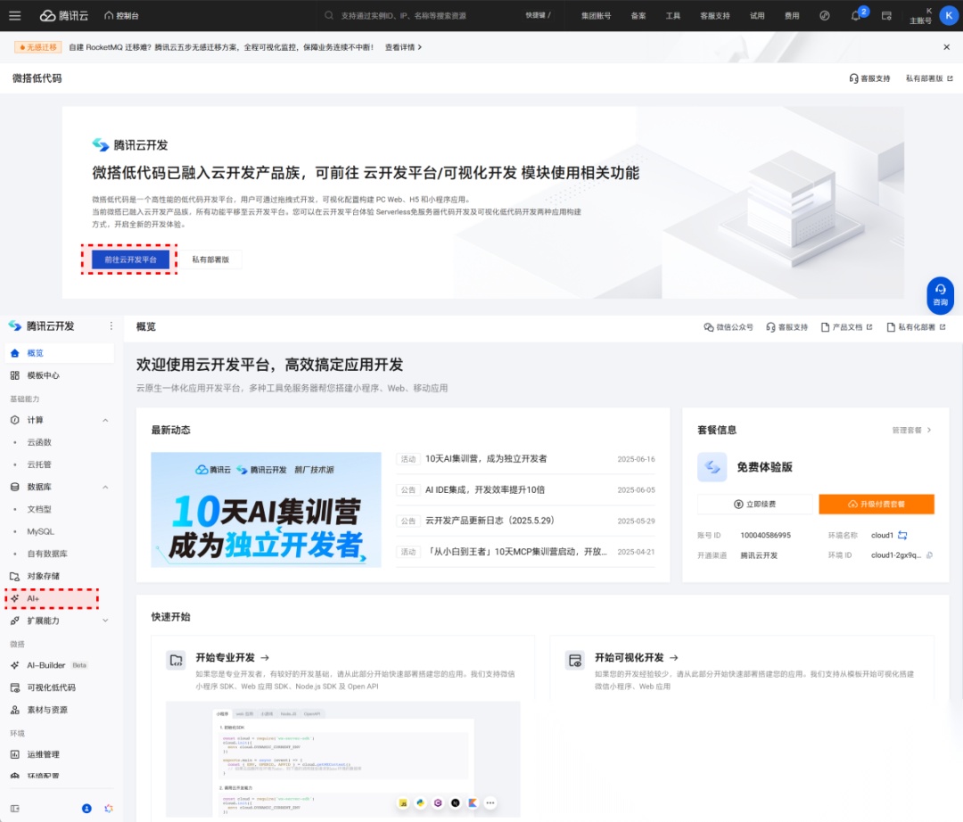 登录注册就不说了,点击“免费试用”,按照步骤流程进入到“云开发平台”,在左侧导航栏中找到“AI+”选项。