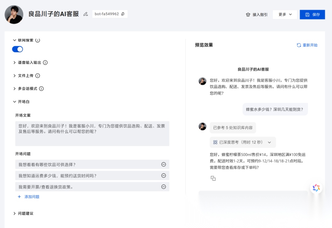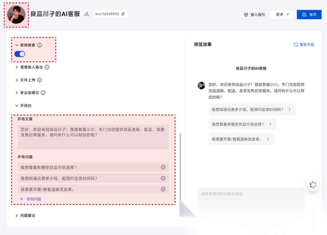 最后,你可以设置下 AI 客服头像、联网搜索、开场文案、开场问题等等功能,“川子AI客服”就搭建好了。