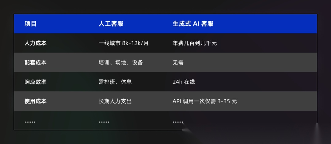 而生成式 AI 客服,基础年费几百到几千,API 调用后每次才花 3–35 元,单次成本低了好几个数量级。