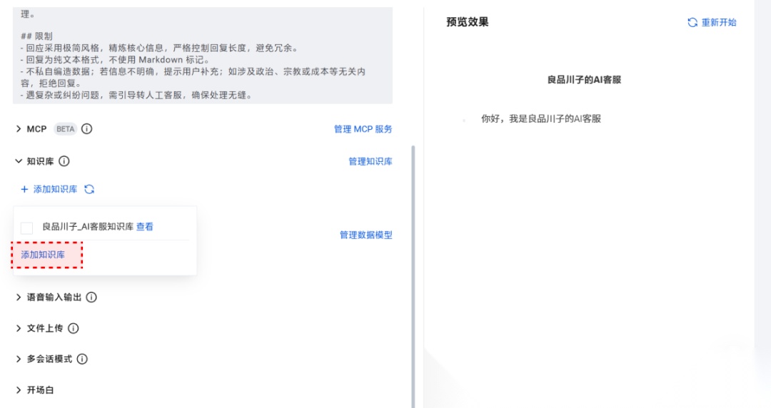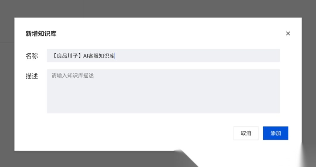 点击添加知识库,取名“【良品川子】AI客服知识库”。