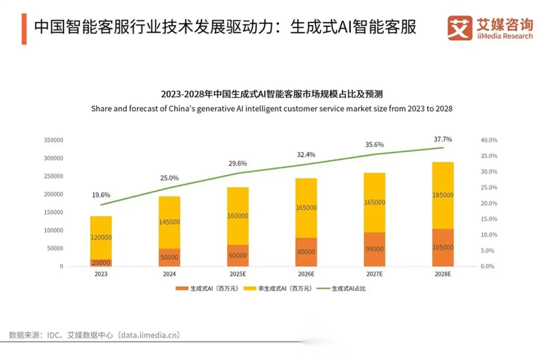 根据《2025‑2026 中国智能客服报告》显示,现在生成式 AI 客服在智能客服中已占 19.6%,预计到 2028 年将接近 37.7%。