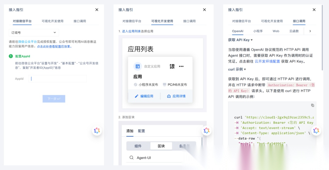 支持对接微信平台、可视化开发、接口调用这三种方式,平台上都有提供相应的教程。