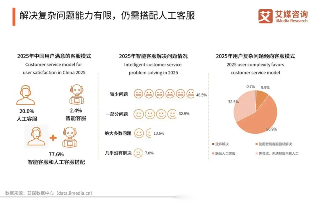 过半用户倾向智能+人工混合模式,56.9%人在遇不到答案时会转人工。