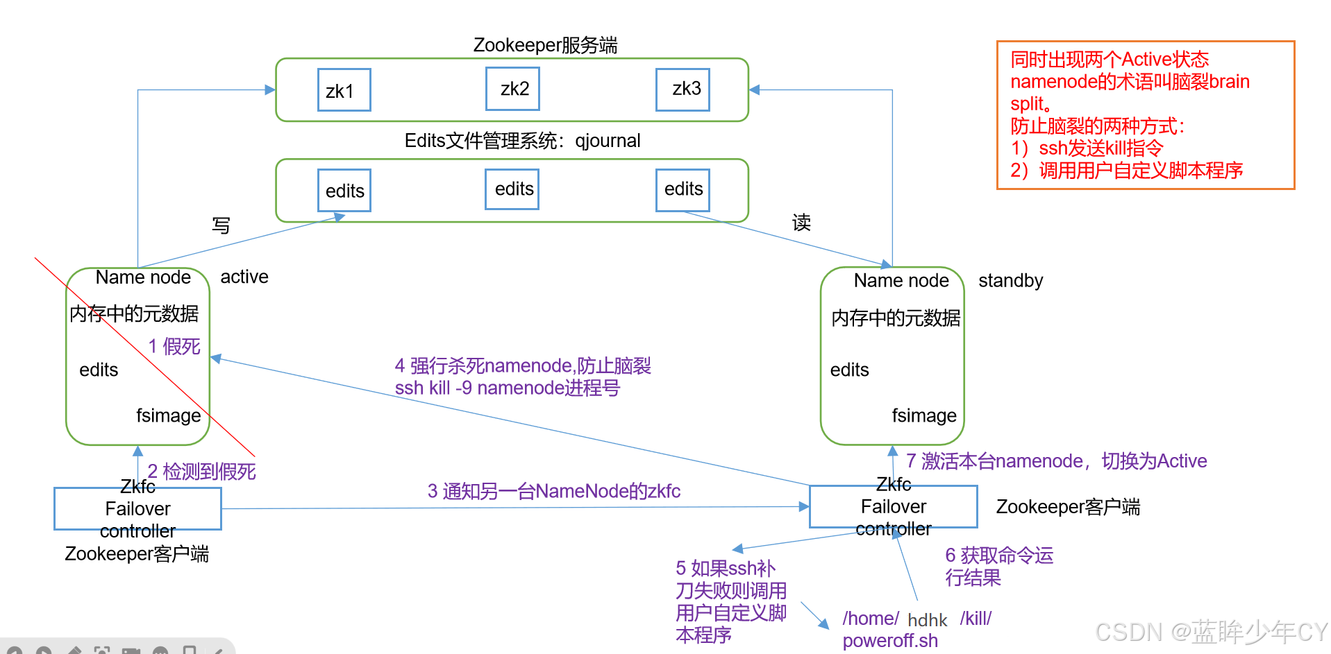 实现了一个zkfailover,常驻在每一个namenode所在的节点,每一个zkfailover负责监控自己所在namenode节点,利用zk进行状态标识,当需要进行状态切换时,由zkfailover来负责切换,切换时需要防止brain split现象的发生。