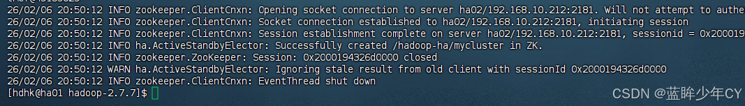 ZKFC是自动故障转移中的另一个新组件,是ZooKeeper的客户端,也监视和管理NameNode的状态,每个运行NameNode的主机也运行了一个ZKFC进程。