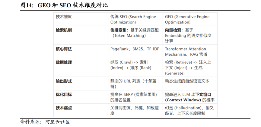 国泰海通把差异说得更“技术化”:传统搜索核心机制是匹配(倒排索引、PageRank),SEO是确定性优化;AI搜索核心机制是分析(向量检索+RAG),GEO是概率性优化——你做的每一个动作,都是在提升“被召回、被采信、被引用”的概率。