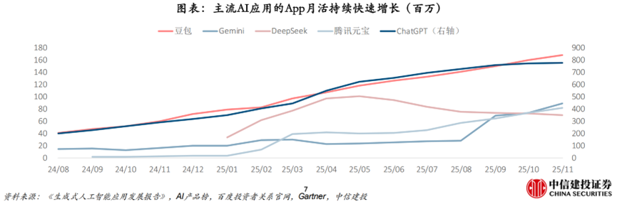 中信建投引用的数据是:ChatGPT与豆包App月活分别达到7.8亿与1.7亿,渗透率都超过10%;而以百度为例,传统搜索入口的月活在6.5—7.5亿之间波动、趋于平缓。