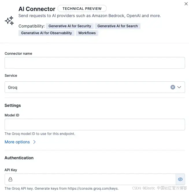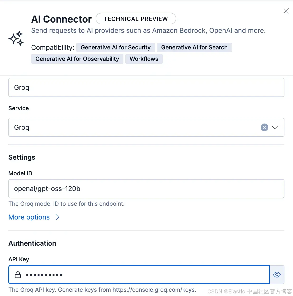 我们已经展示了这不仅可以用来加速 Elastic 的自然语言处理(NLP)搜索,还可以用来加速 Elastic Agent Builder。Agent Builder 最近发布了技术预览版,现在可以通过 Groq 端点连接 Groq。Agent Builder 在 Elastic 9.1+ 可用。我们可以使用之前使用的相同 API key。