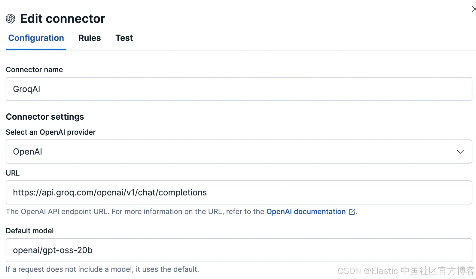如果你使用的是托管版 Elastic,在本文撰写时,你可以使用 Groq 上与 OpenAI 兼容的端点连接 Elastic。为此,选择 OpenAI 服务,并使用指向 Groq URL 的自定义 URL,如下所示: