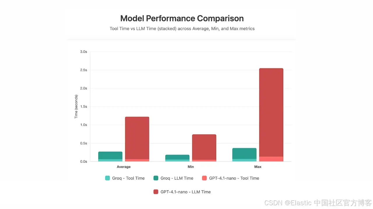 如你所见,内置的 Elastic LLM 表现不错,但 Groq 平均仍快了近 3 倍。你会注意到整体速度比外部应用慢得多。这是因为我们在 Agent Builder 中设置工具时仅使用了 index。因此,大部分时间花在了 Agent Builder 的推理上(即检查 index)。我们可以使用模板化的 ES|QL 工具替代 index,这将使结果更接近外部应用。