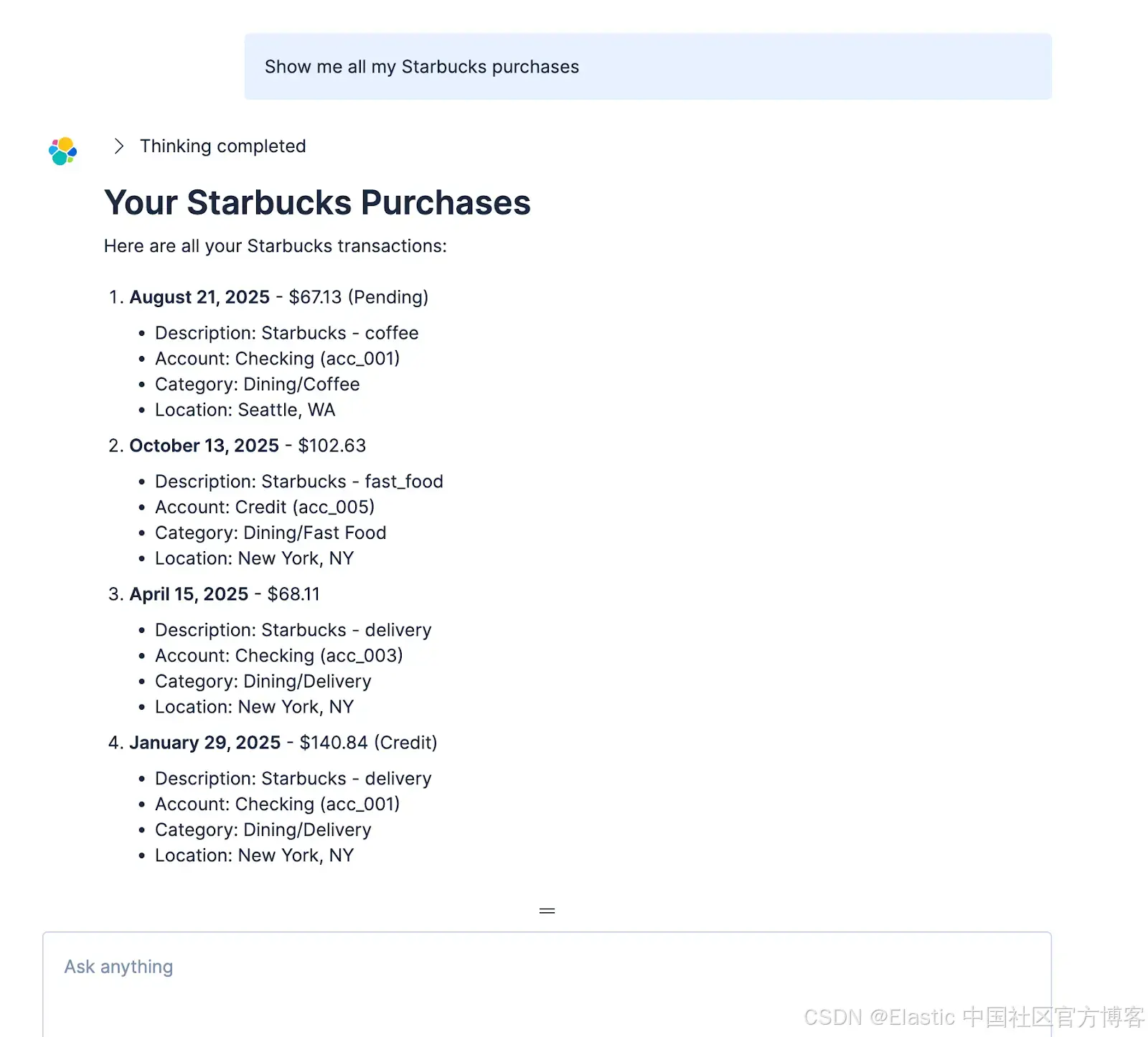 你可以使用这些工具进行交易搜索。LLM 将使用内置工具,如 index_explorer、generate_esql 和 execute_esql,它们会尝试找到相关的索引、检查结构,并执行生成的 Elasticsearch Query Language( ES|QL )查询。然而,这会带来一些挑战: