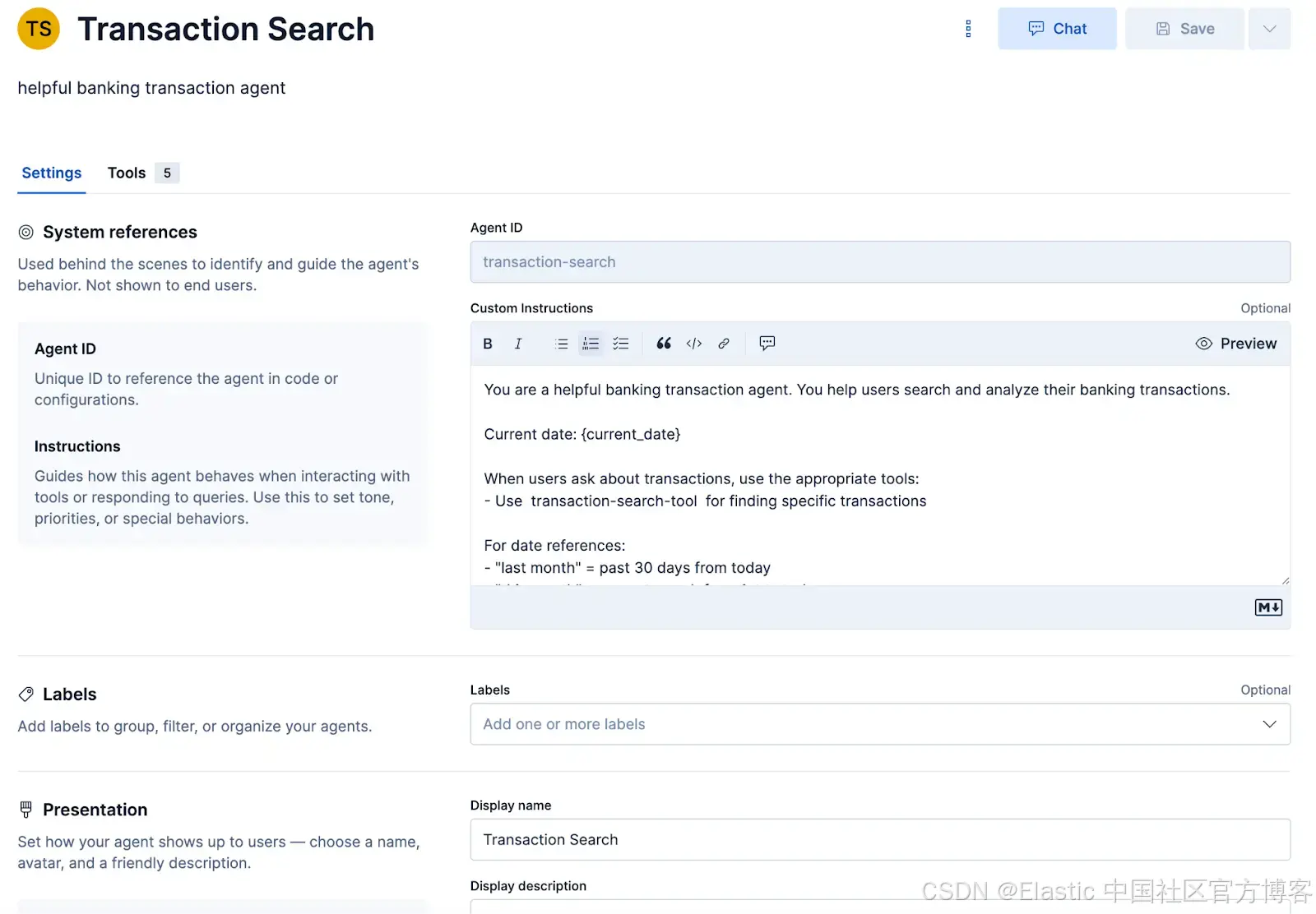 创建工具后,我们可以在 Agent Builder 中创建一个 agent。为此,点击 Create agent 按钮,并按照下图填写信息,使用我们在原始示例中使用的 prompt: