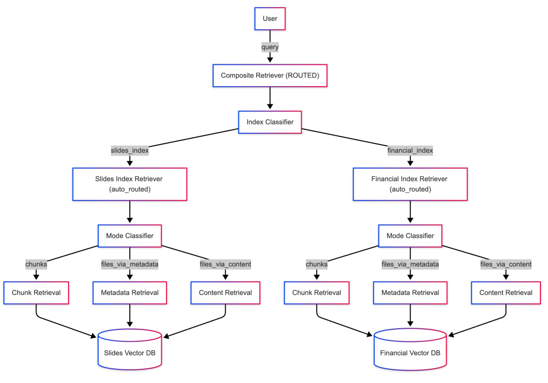 智能路由:通过为每个子索引提供描述(例如,「用于公司财务报告」),复合检索器利用一个 agent 层来分析用户查询,并将其路由到一个或多个最相关的子索引。