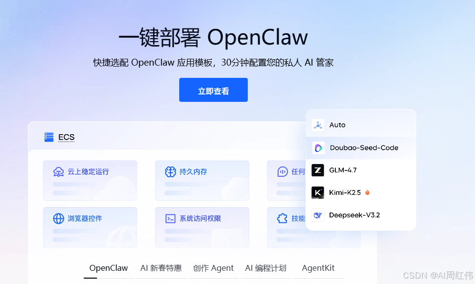 - 对于企业级开发需求,支持您选择火山方舟模型广场的任意大语言模型,其中Doubao-Seed-Code、GLM-4.7、DeepSeek-V3.2和Kimi-K2-Thinking等多款模型服务现已全面适配OpenClaw的技术生态。