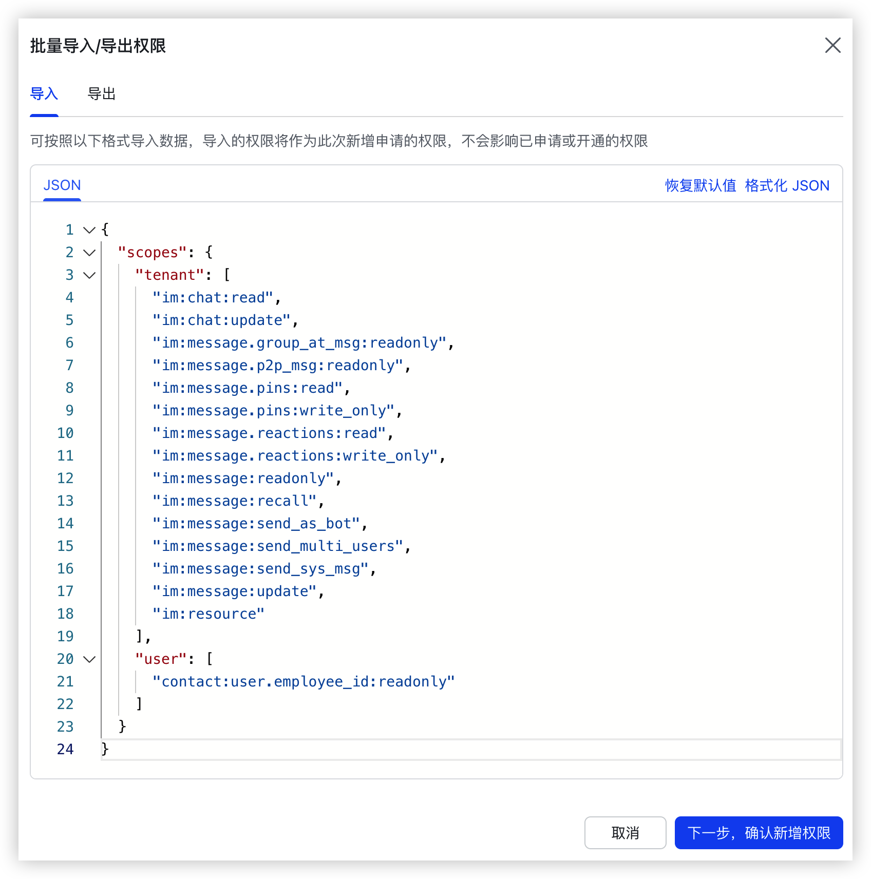 - 在“导入”页签中,将如下权限替换原有示例,单击“下一步,确认新增权限”按钮。