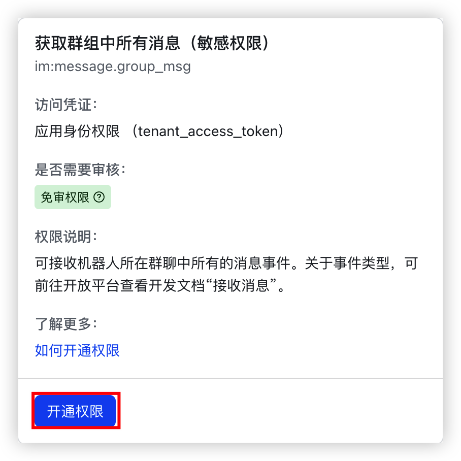 - (可选)若您期望将机器人添加到聊天群组中使用,需开通获取群组消息权限。否则,请跳过本步骤。