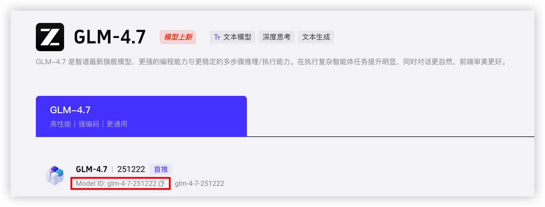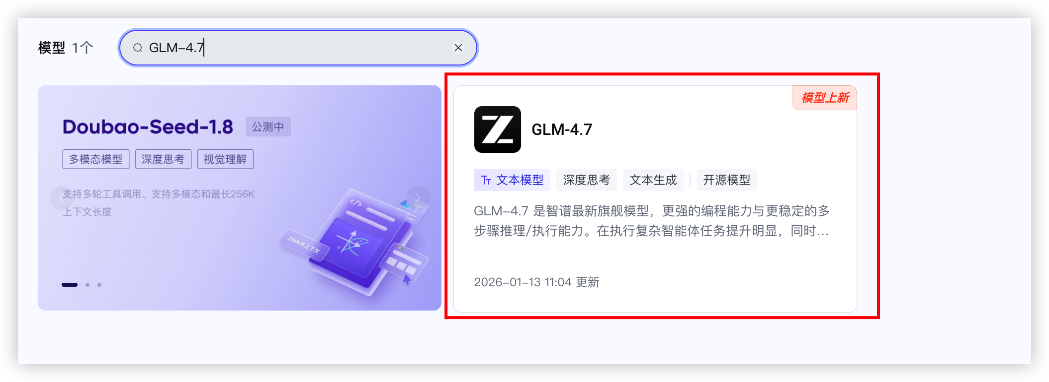 - 在左侧目录树选择“智能广场 > 模型广场”,单击您期望OpenClaw使用的具体模型进入其详情页。本文以“GLM-4.7”为例。
