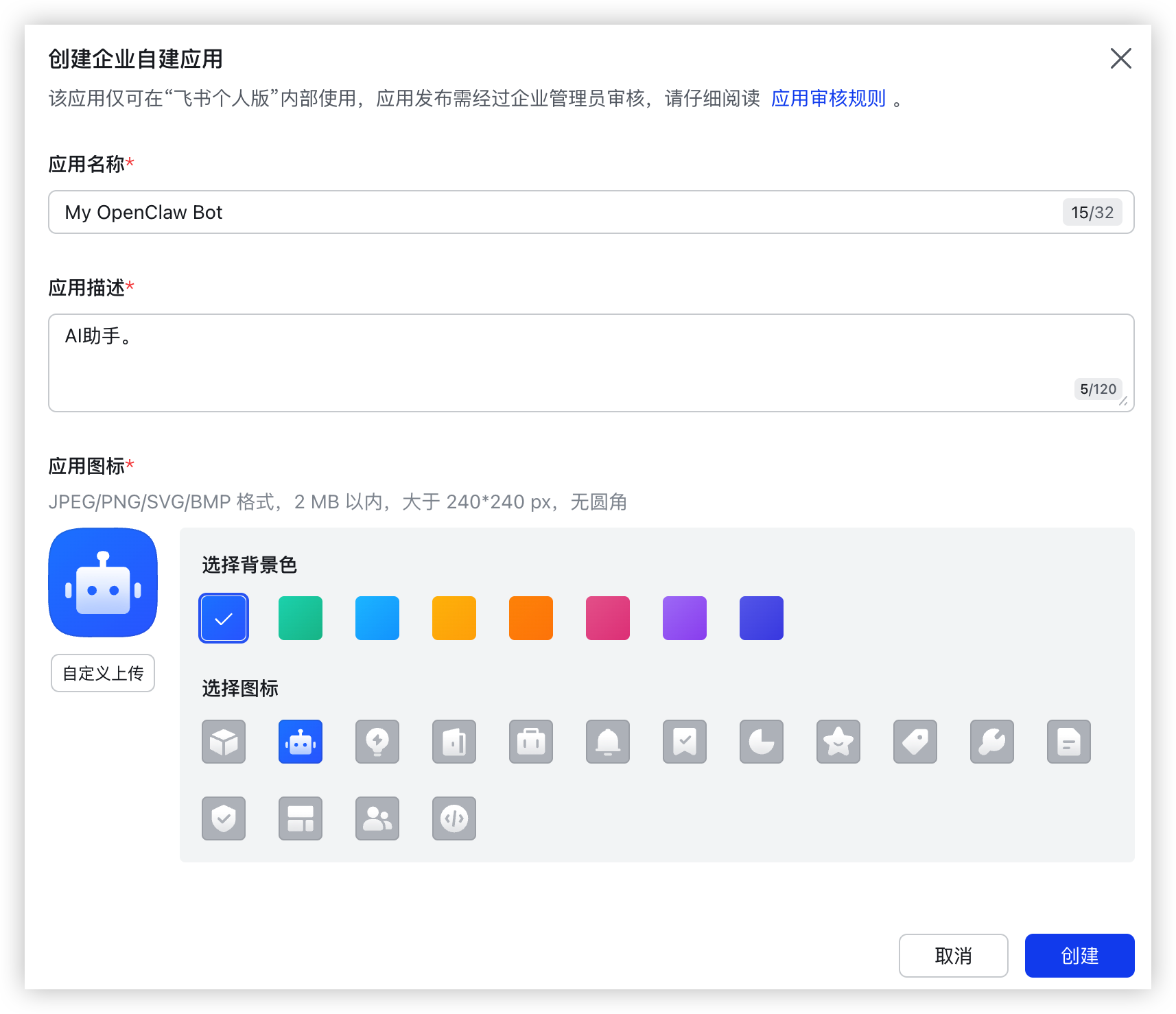 - 需配置应用名、描述及图标。