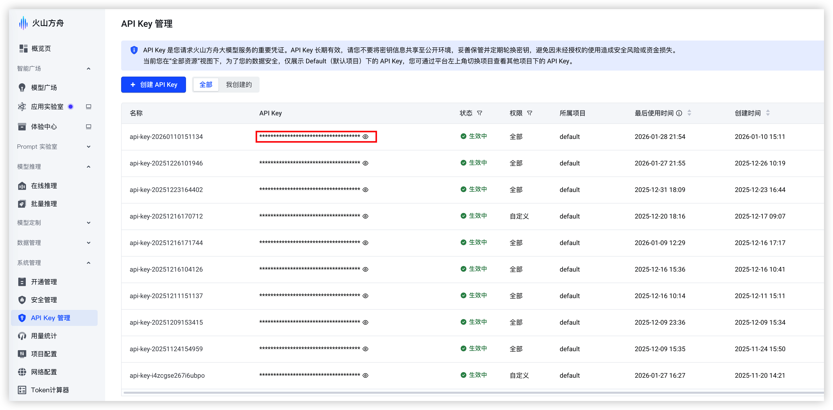 - 在左侧目录树选择“系统管理 > API Key 管理”,创建并获取API Key。