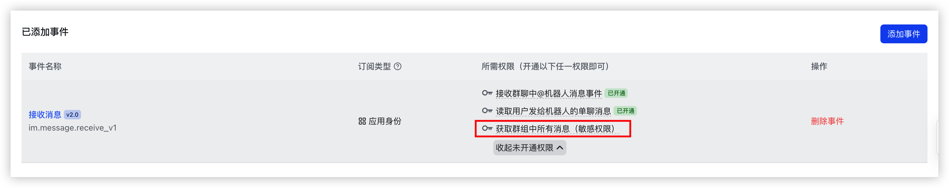 - 在添加事件对话框中,选择“应用身份订阅”页签,并勾选“接收消息”及其它您需要订阅的事件,单击“确认添加”按钮。