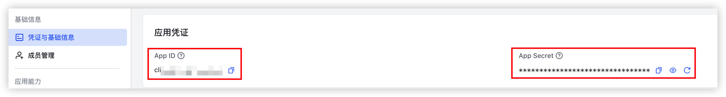 - 在“应用凭证”模块中,获取并记录App ID与App Secret信息。