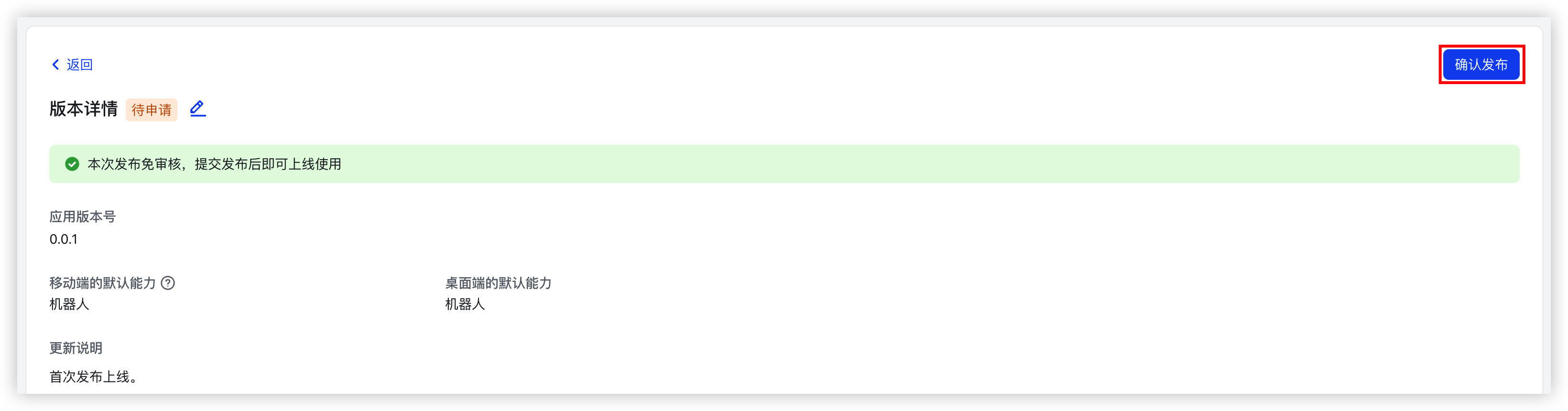 - 单击页面右上角的“确认发布”按钮,完成应用发布。