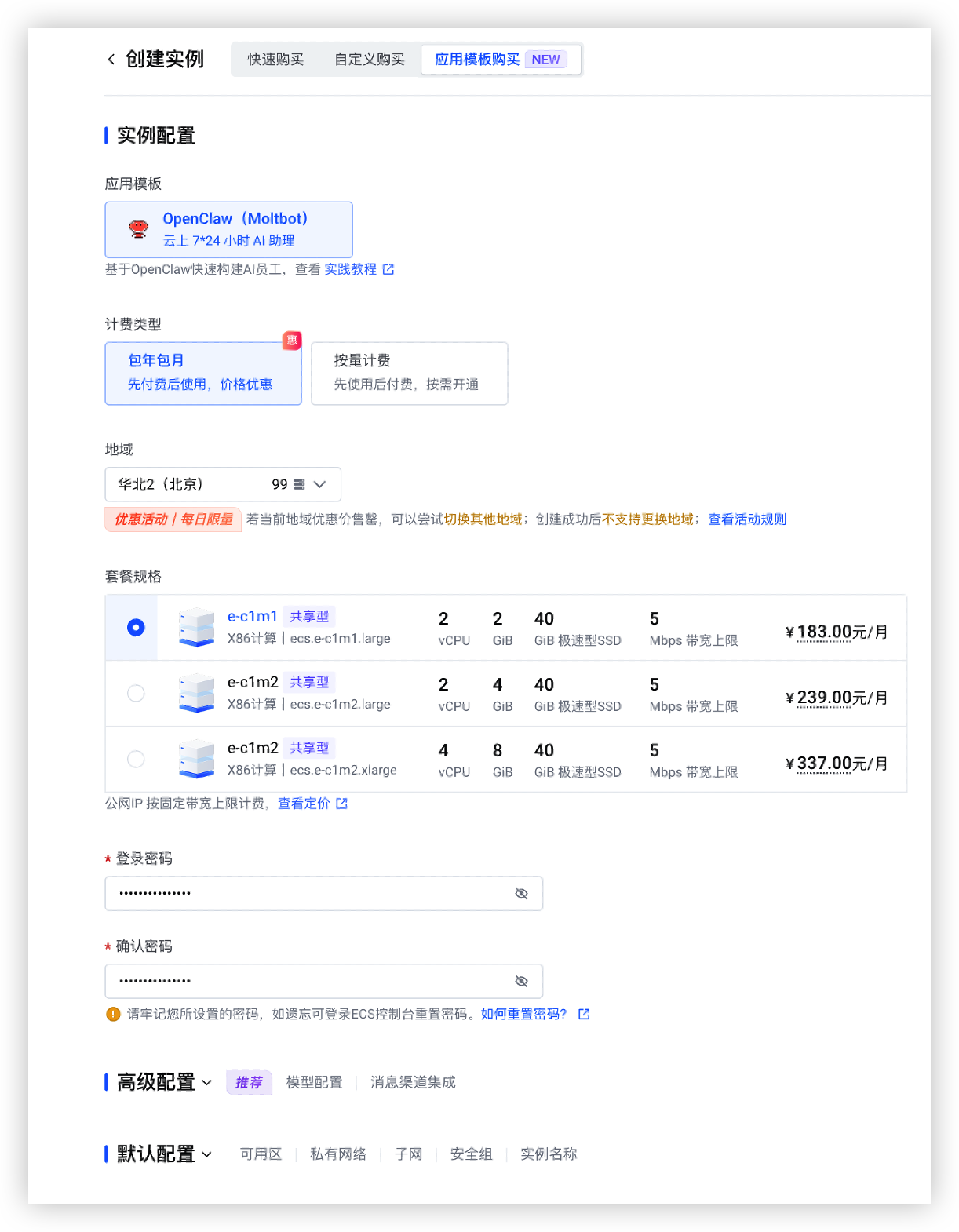 - 通过应用模板快速购买预置了OpenClaw的云服务器,配置如下参数。