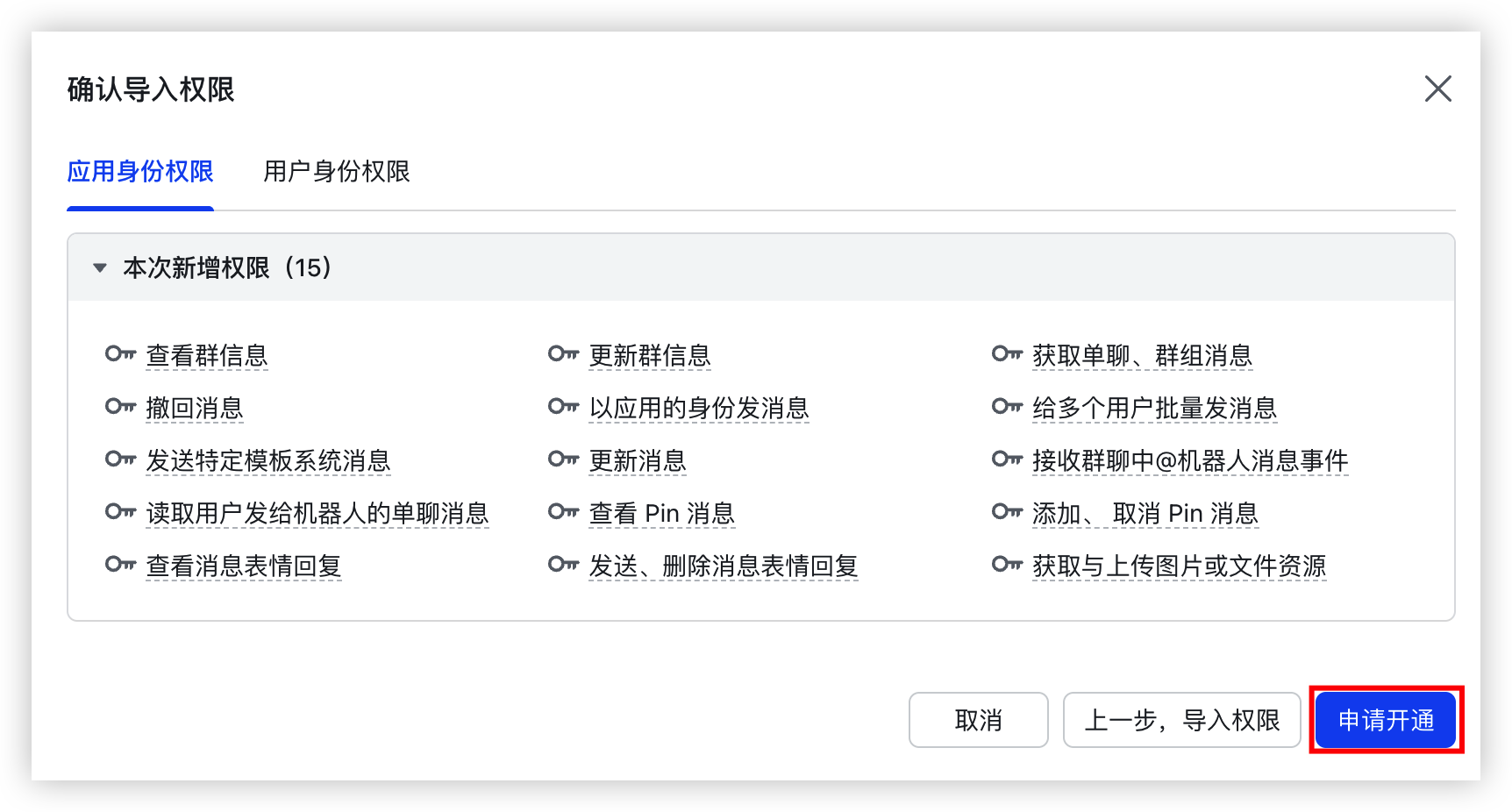 相关权限的具体含义可查看飞书API权限列表。